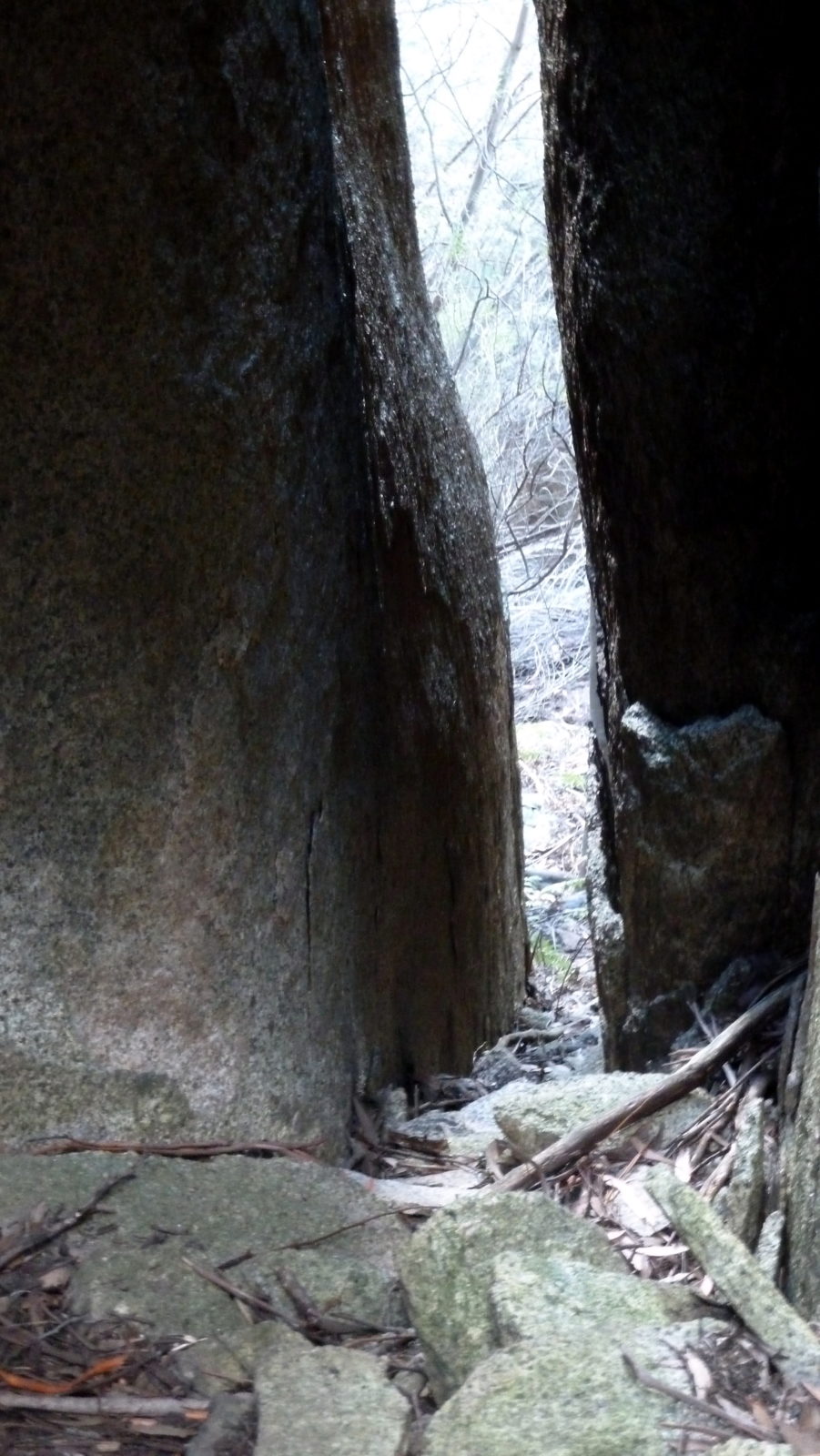 However on the way up I went through this horrible thick dead scrub that did its utmost best to scratch and claw at my face and eyes and did successfully do so. A lot of this dead stuff was facing downhill and was hard to get past easily. Towards the top I came upon several layers of large rocks including a couple of caves and labelled one rock cave and one rock shelter. As well there seemed to be several, although I only GPS’d two type of small enclosed mini valleys that were surrounded by tall rocks and I had to crawl and edge my way through holes and cracks to get into and out of each. I named each of these as Labyrinths ie 1 & 2. Towards the top I squeezed through this long rising slit but I could only fit by taking off my day pack and edging through sideways feeling the rock scraping my clothes like sandpaper. At the top is another small valley surrounded by rocks on the north and south sides but with this thick nearly impenetrable Namadgi scrub. On the top of the second highest rock I could easily see up the Rendezvous Valley to Cotter Cap and Spilt Rock, down to the Gudgenby Valley and north across to the Orroral Valley. I dreaded going back through the rocks area and was able to push through to the north and after 50m it opened up and I was able to go back down to the north but at least 150m further to the east from the route up I had taken. It was much easier and with less scrub and more open with ferns which was good as I was running out of time.