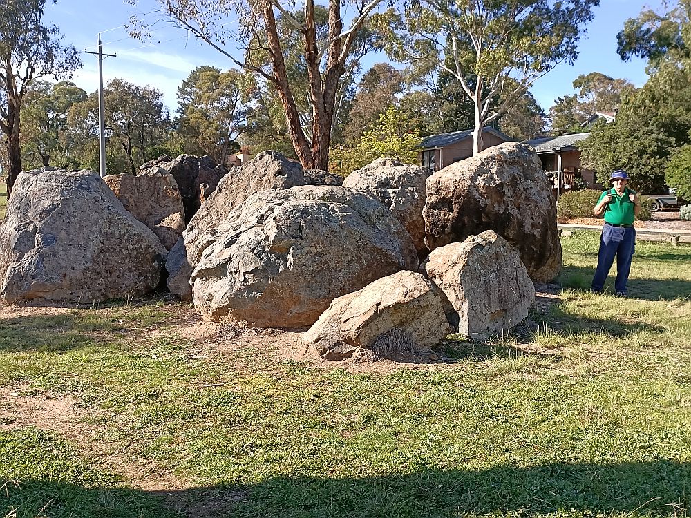 Soon near Brophy St we came upon a collection of really large rocks that looked like they had been placed there during the construction of the suburb. Bob and I stopped and took some pictures. These rocks in some cases were large and taller than us.