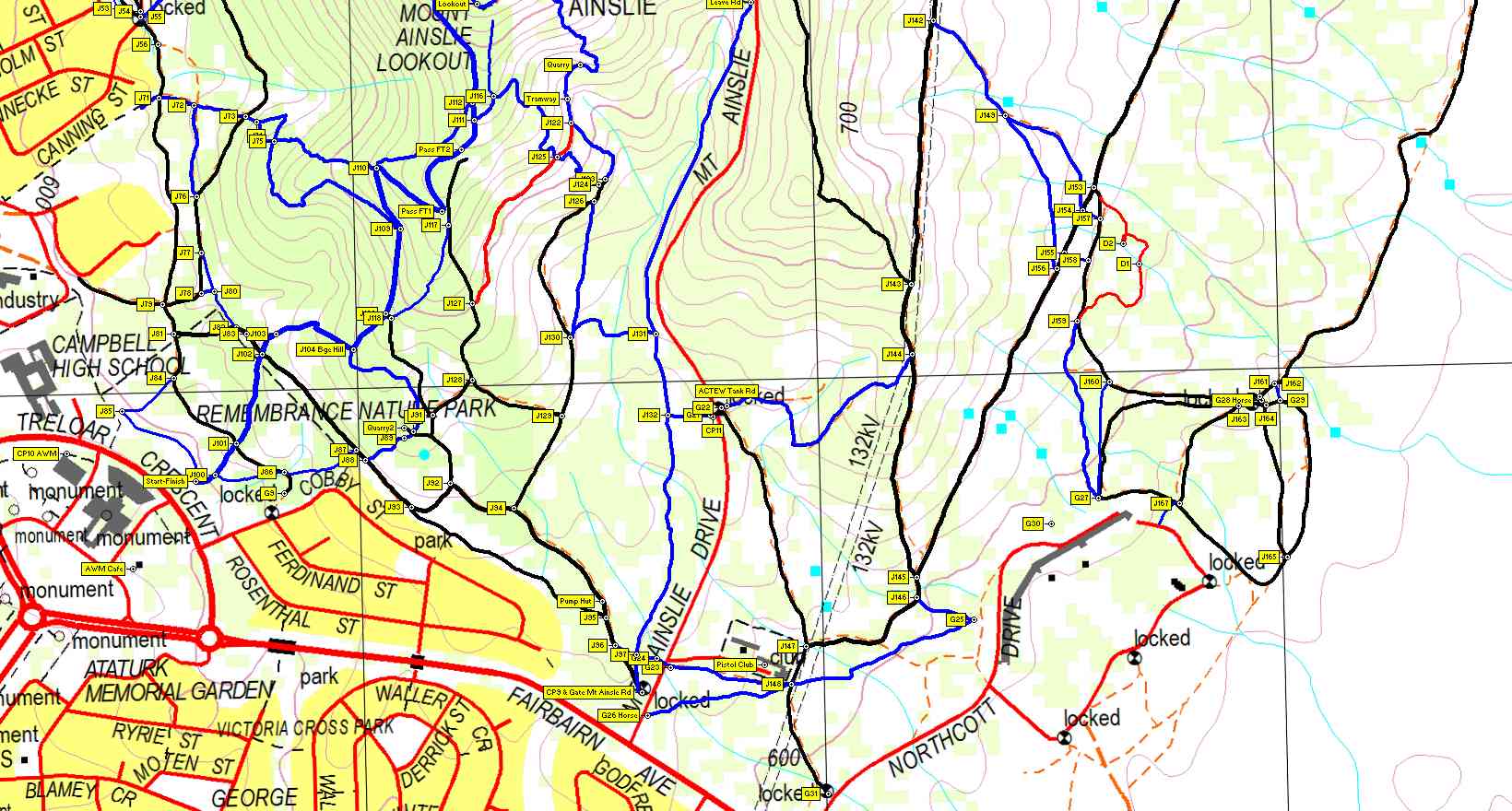 | ACTEW Tk | This another nominally named FT that goes from a gate (G22) on Mt Ainslie Drive past an access track to the large ACTEW water reservoir and up to join the East 132KVA FT |